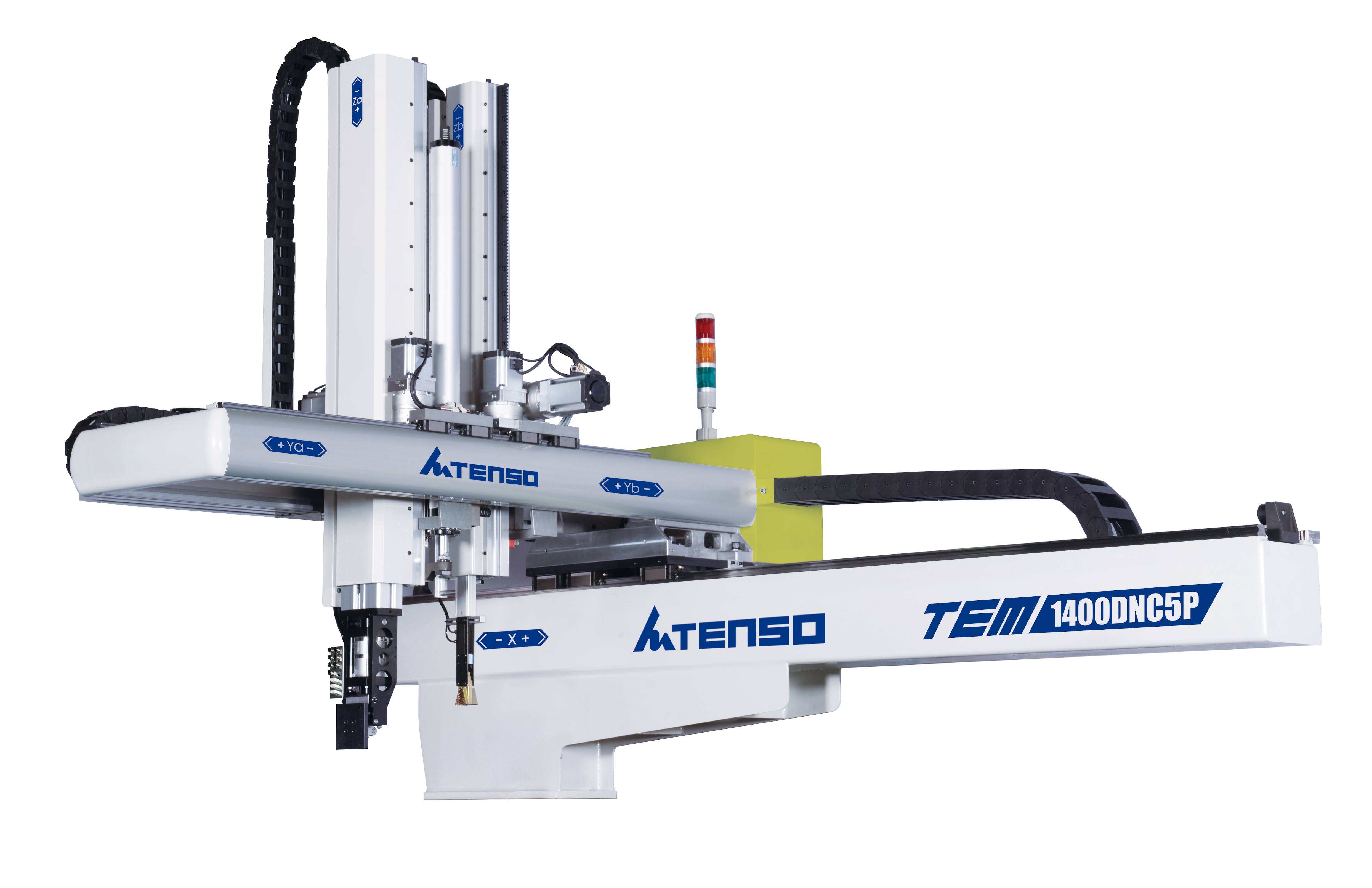 TEM-DNC5P Series – Dual-arm model - Powered by the latest generation of Tenso technology, the TEM series features a telescopic vertical arm combined with Tenso’s proprietary air-cylinder load-balancing system — a fully self-developed structural design. This delivers greater performance stability and more flexible load capacity, making it the ideal choice for standard automation on 350 to 1300-ton injection molding machines. With our intuitive, in-house developed T-12 Controller, programming and operating the robot arm is incredibly easy — you’ll get the hang of it the moment you touch it.